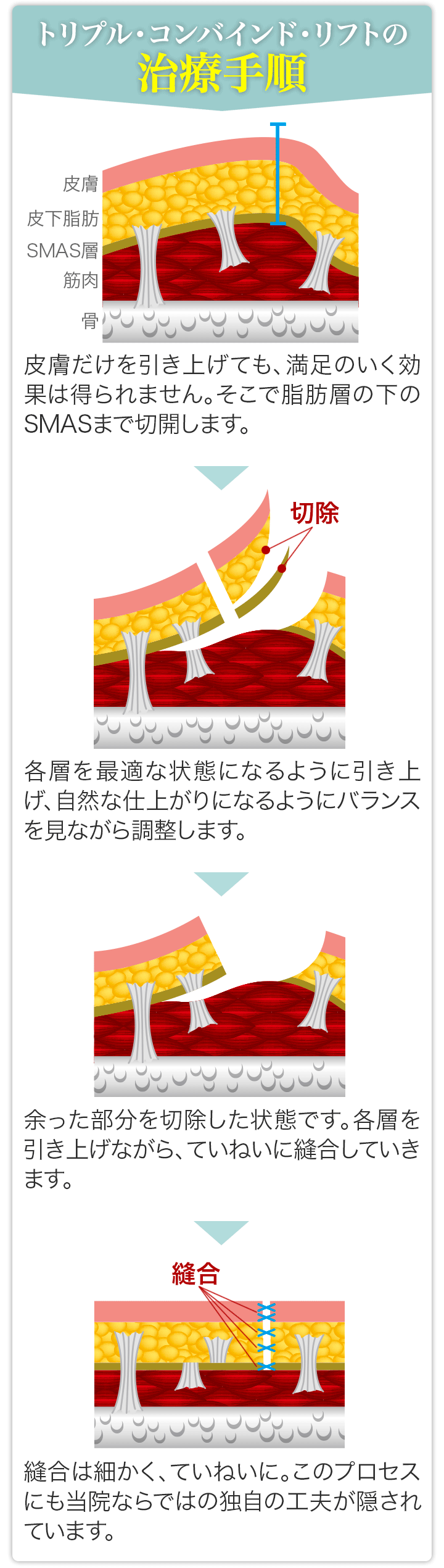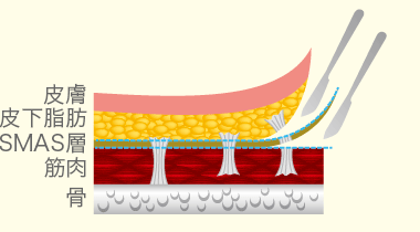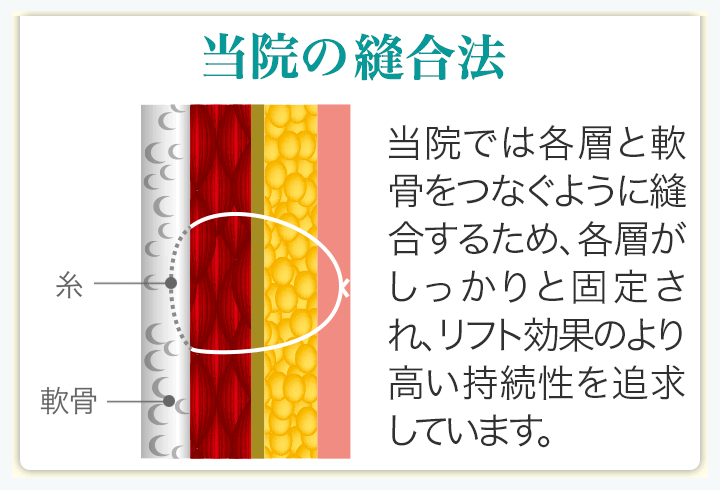 皮膚と脂肪、筋膜の各層を複数箇所で細かく縫合・結合したうえで、それらリフトアップした組織全体を軟骨などの安定した組織にしっかりとつなぎ止め、組織の変動を防いでいます。こうすることで、手術によって得られたリフトアップ効果の持続性を高め、ナチュラルな若さをより長く保つことを可能にしているのです。