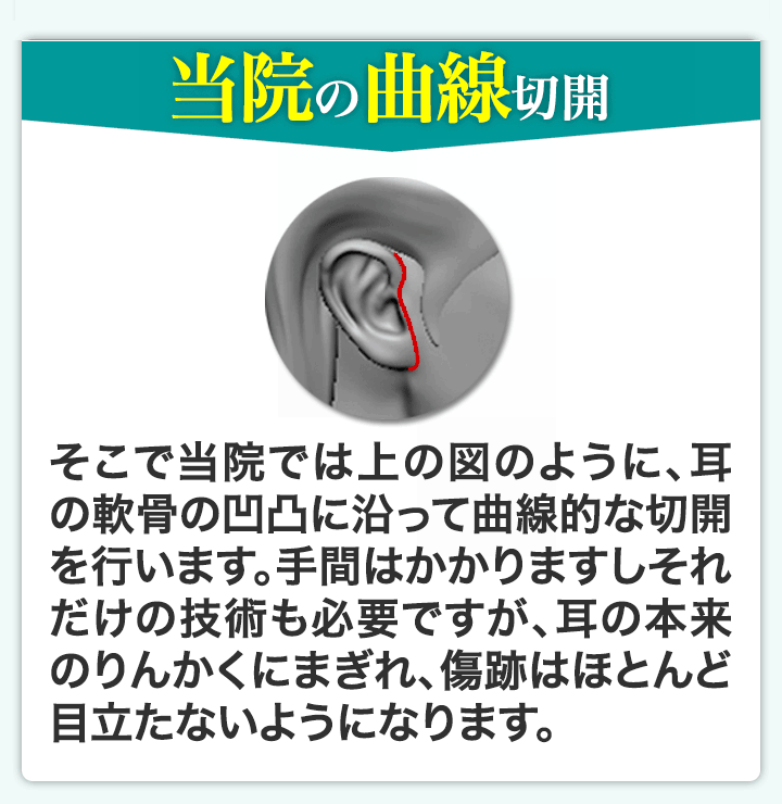 A. 当院のフェイスリフトは腫れもほとんど目立たないため、お仕事をされている方も負担を感じず受けていただけます。また当院では耳の軟骨に沿って曲線的に切開を行いますので傷跡は時間とともに目立たなくなります。