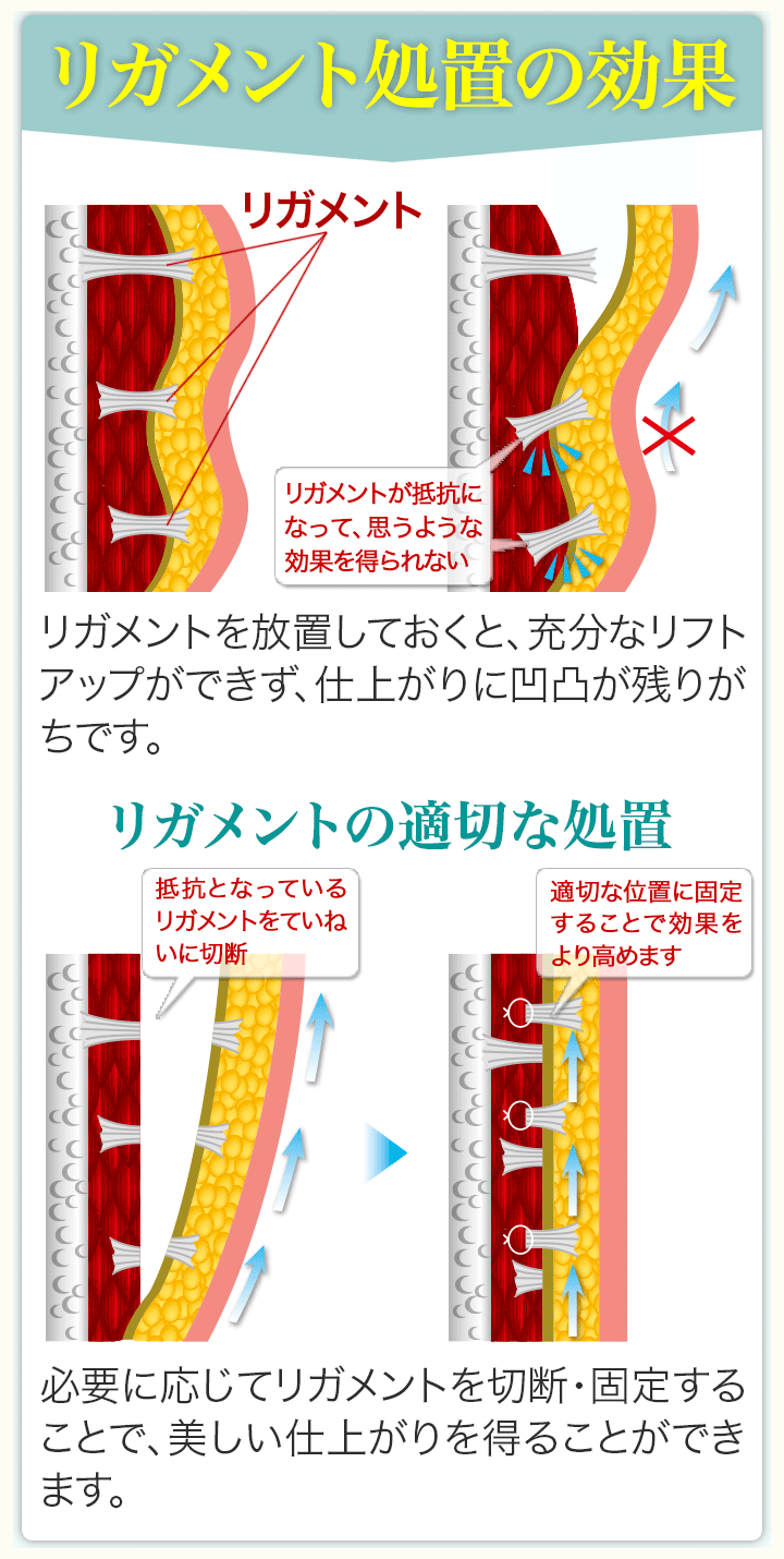 皮膚と脂肪層と筋膜は層状に重なっていますが、それらをつなぎ合わせる「リガメント」という組織があります。状態に応じてリガメントも丁寧に処理し、適切な位置に再固定します。最後にアメリカ製のファイバー・スコープを患部に差し込み、治療効果を確認します。 ![]() |