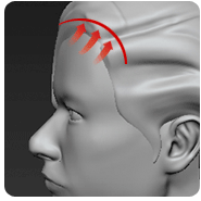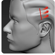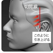 前に述べたフェイス・リフトは、頬から顎にかけての引き上げが目的です。さらに、コメカミ部分のたるみを引き上げたい時は、髪の毛の中を切って引き上げます。 フェイス・リフティングと同時にコメカミのリフティングを希望される方も多く、それによる効果も期待できます。 |
