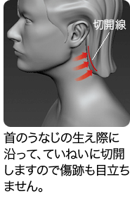 当然皆様は「耳の前のあたりを切って…」ということは漠然とわかっていらっしゃるようですが、具体的な切開ラインについてご説明します。