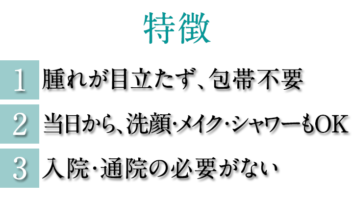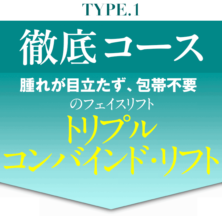 A. 「トリプル・コンバインド・リフト法」では特殊な縫合法で行うため抜糸の必要もなく、原則として入通院は不要です。術後、もしも気になることや心配なことがありましたら、すぐにお知らせください。