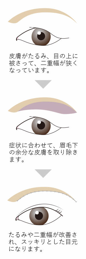 加齢によって上まぶたがたるむと、その皮膚が目の上に被さってきます。すると二重幅が狭くなり、目つきが悪くなったり視野を妨げたりします。さらに目を開こうとして額の筋肉を使うため、前額にシワができたり、頭痛・肩こりの原因にもなります。![]() |