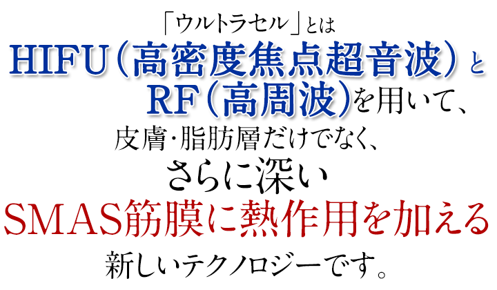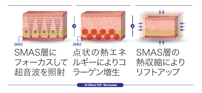 | SMAS(表情筋筋膜)に、特殊な超音波で点状の熱エネルギーを限局して加えます。それにより、SMAS筋膜が収縮し、リフトアップ効果をもたらします。 |
