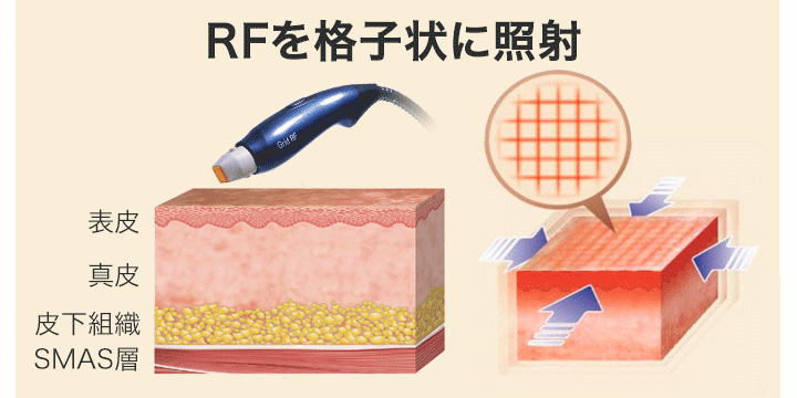 | RF(高周波)を格子状に照射することで、コラーゲン繊維を熱収縮させます。 これにより、皮膚は引き締まり、シワ・たるみを改善します。 |